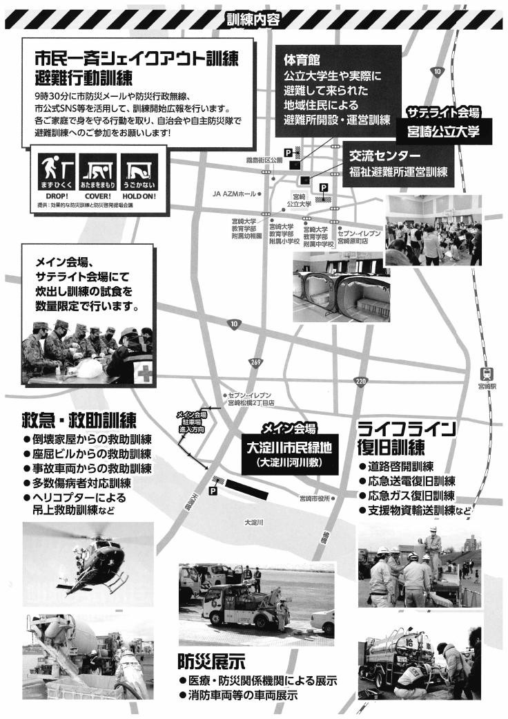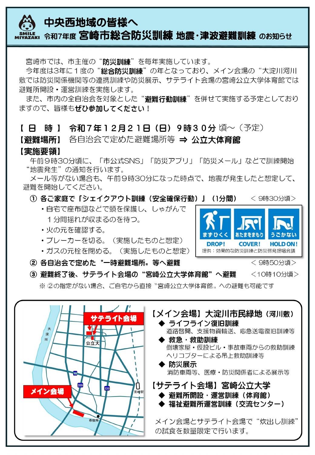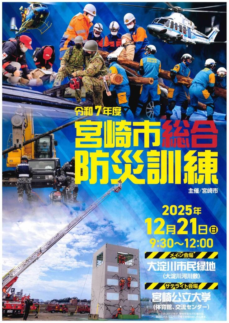 令和7年12月21日(日)、宮崎市総合防災訓練が実施されます。 中央西地域では、宮崎公立大学(体育館・交流センター)がサテライト会場となっています。