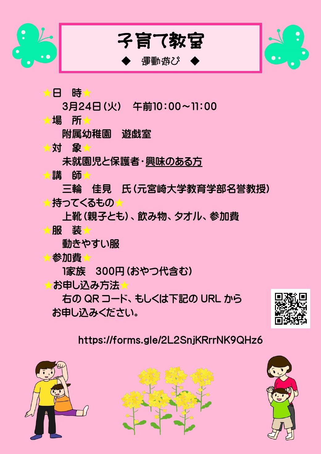 宮崎大学教育学部附属幼稚園では、未就園児と保護者の方を対象とした子育て教室「運動遊び」を開催します。